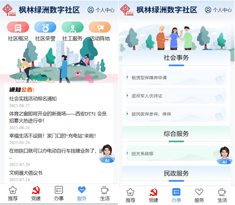 “新生儿居民医保怎么办理?”“临近毕业,党组织关系如何转接?”“残疾人两项补贴如何申领?”对于这些民生关切的问题,枫林绿洲社区系统梳理出居民反映集中的高频需求,联合西安荣天信息技术有限公司,探索“AI+社区”智慧模式,通过AI数字人将居民海量、碎片化的需求转化为结构化数据,并集成至“枫林绿洲智慧社区”微信公众号平台。